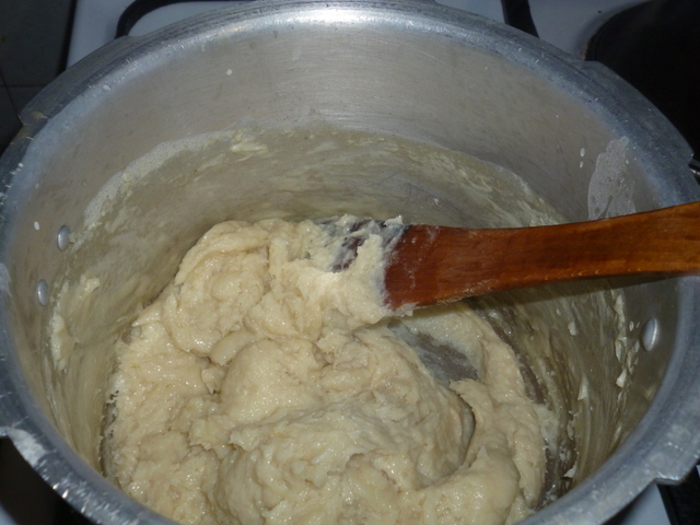 *இப்போழுது கெட்டியாகி பாத்திரத்தில் ஒட்டாமல் வரும் போதோ அல்லது ஈரக்கையால் தொட்டால் மாவு ஒட்டாமல் வந்தாலோ அடுப்பிலிருந்து இறக்கவும்.